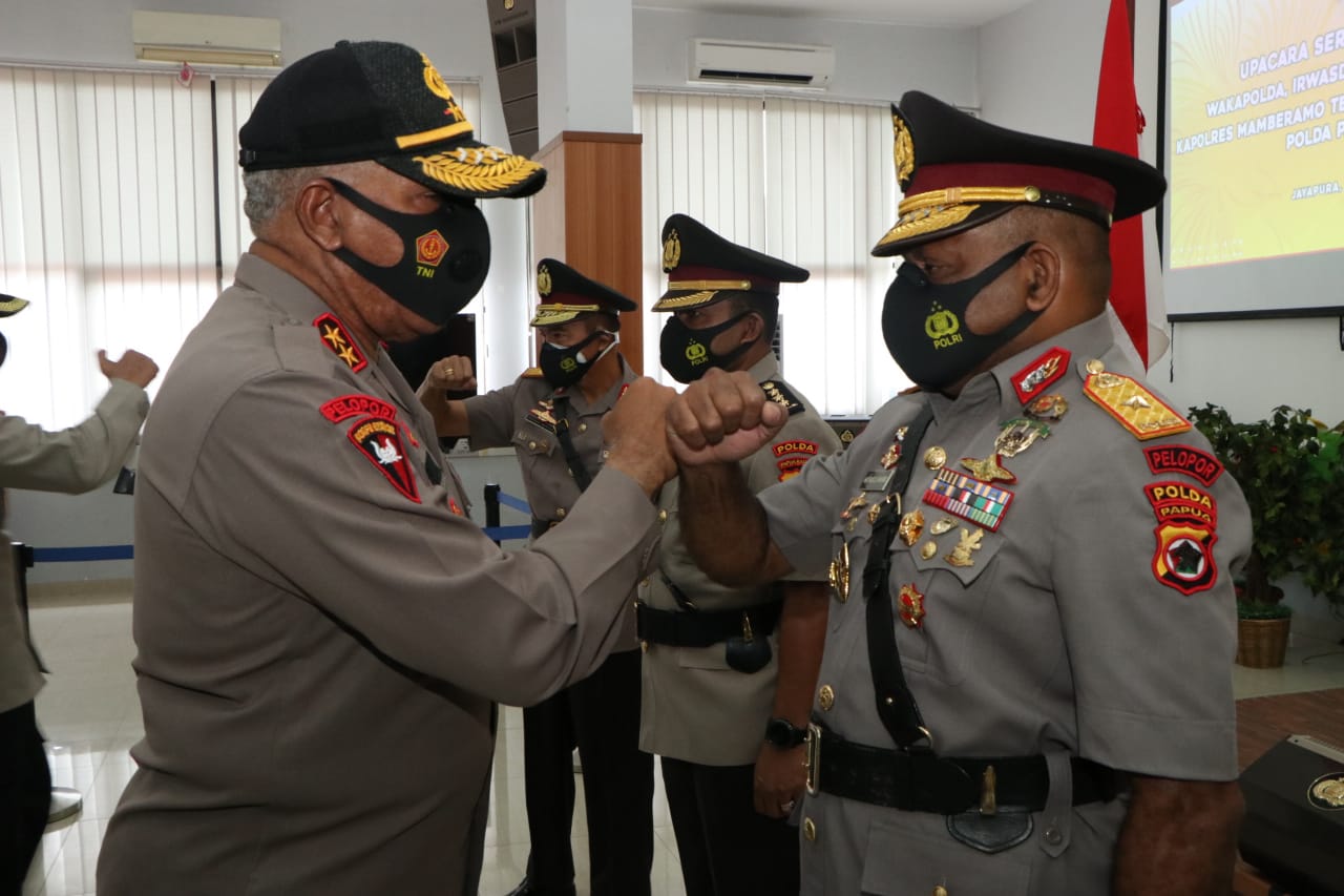 JAYAPURA-NUSANTARAPOST.ID-Kapolda Papua, Irjen Pol. Paulus Waterpauw memimpin langsung upacara Serah Terima Jabatan Wakapolda, Irwasda, Dirintelkam, Kabidkum, Kapolres Yahukimo dan Kapolres Mamberamo tengah yang bertempat di Aula Rastra Samara Polda Papua, Kamis 17 September 2020.