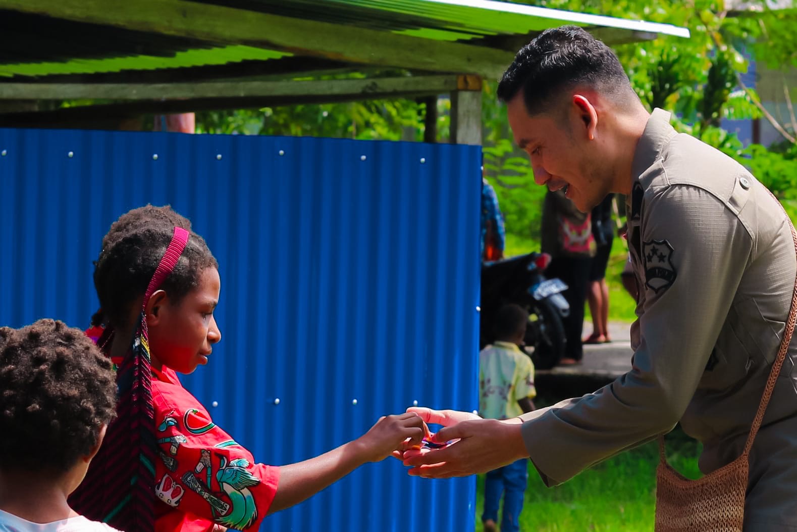 Dalam suasana penuh keakraban, Bripka Heribertus A.B. Tena, S.Tr.AK., M.Si., terlihat berinteraksi dengan anak-anak dengan penuh kasih. Ia meyakini bahwa mereka adalah cahaya kedamaian yang akan menerangi Papua di masa depan.